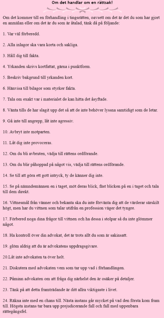 ”Om det kommer till en förhandling i tingsrätten, oavsett om det är det du som har gjort en anmälan eller om det är du som är åtalad, tänk då på följande:”