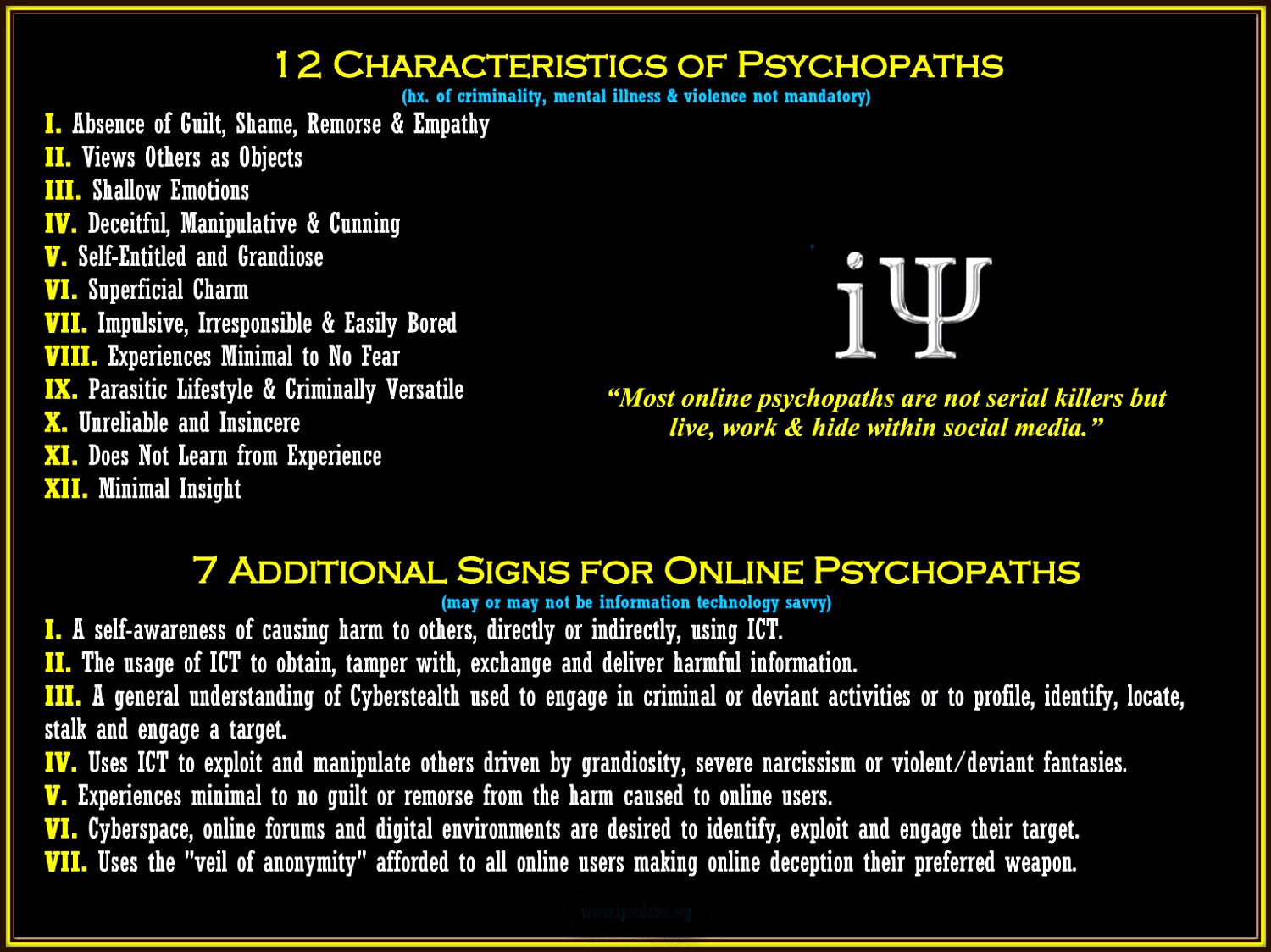 ”Remember also though that to be diagnosed as a psychopath, someone must tick off most or all of these traits we have detailed above, not just one or two. There is a big difference between someone having some psychopathic traits, versus being a full blown psychopath”