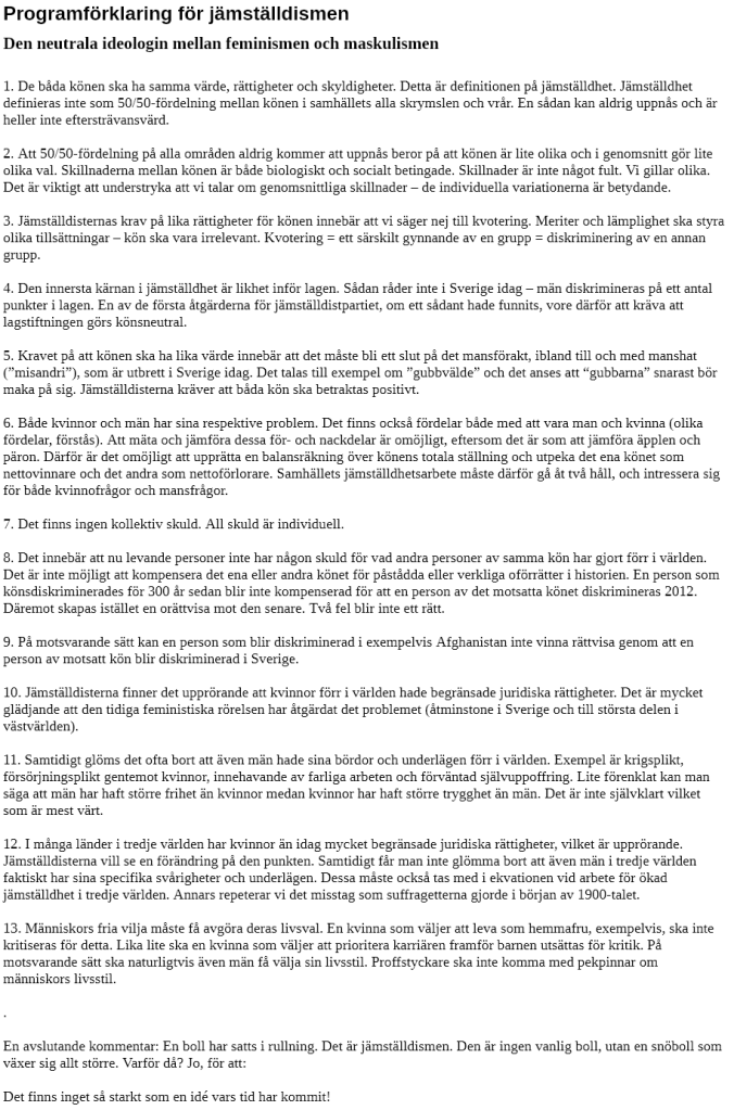 Jämställdismens programförklaring består att 13 punkter som syftar till att skapa en balanserad jämställdhetspolitik som tar lika stor hänsyn till bägge könen och så långt det är möjligt baseras på vetenskap, statistik och fakta istället för ideologi, godtycke och subjektivitet, och tar hänsyn till individens rätt att bestämma över sitt eget liv och göra sina egna val.